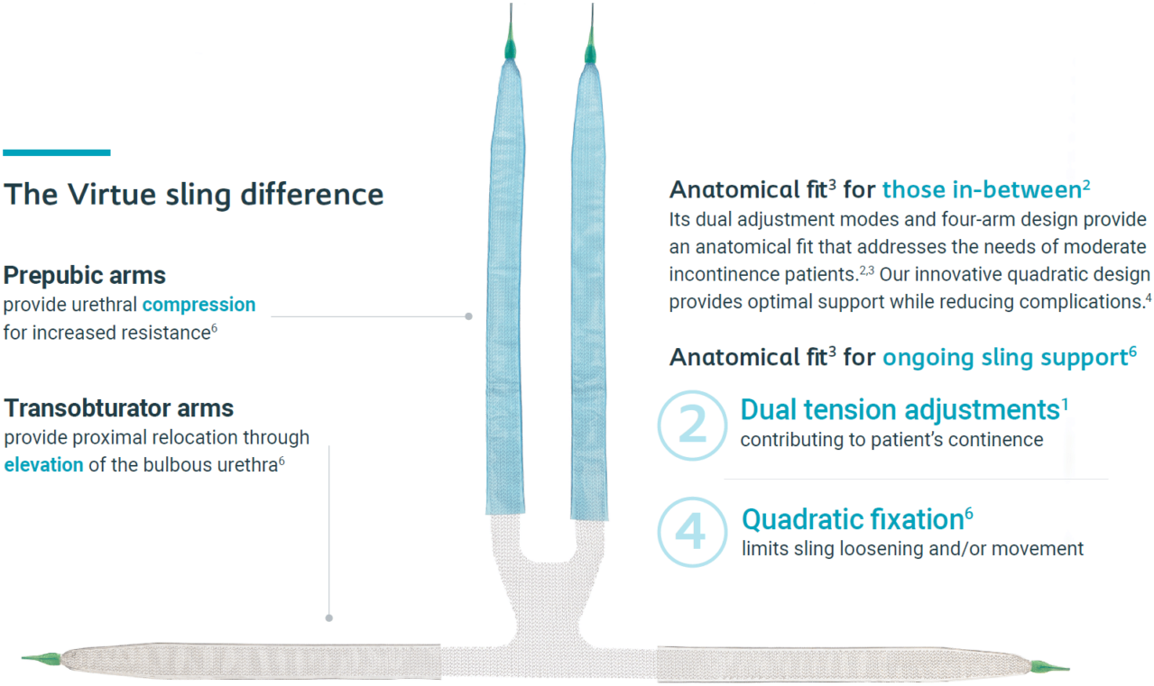 The Virtue Male Sling System is an implantable, suburethral support sling indicated for the treatment of male stress urinary incontinence (SUI).